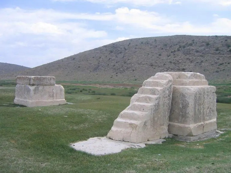 At a more remote part of the site, after crossing a brook, are the fire altars located. These two free-standing limestone plinths are known as twin fire altar supports. These are believed to be the altars to Anahita and Ahura Mazda. The stone dressings details suggest that Cyrus the Great was responsible for the construction of these.